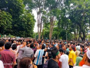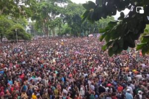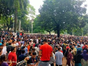 হাজারো মানুষের মুহুর্মুহু স্লোগানে প্রকম্পিত হচ্ছে পুরো এলাকা। একদিকে জগন্নাথ হল, অন্যদিকে বঙ্গবন্ধু টাওয়ার, আরেক দিকে দোয়েল চত্বর ছাড়িয়ে জনতার ঢল ছড়িয়ে পড়েছে। রাজধানীর বিভিন্ন এলাকা থেকে আরও লোকজন শহীদ মিনারের দিকে আসছেন।